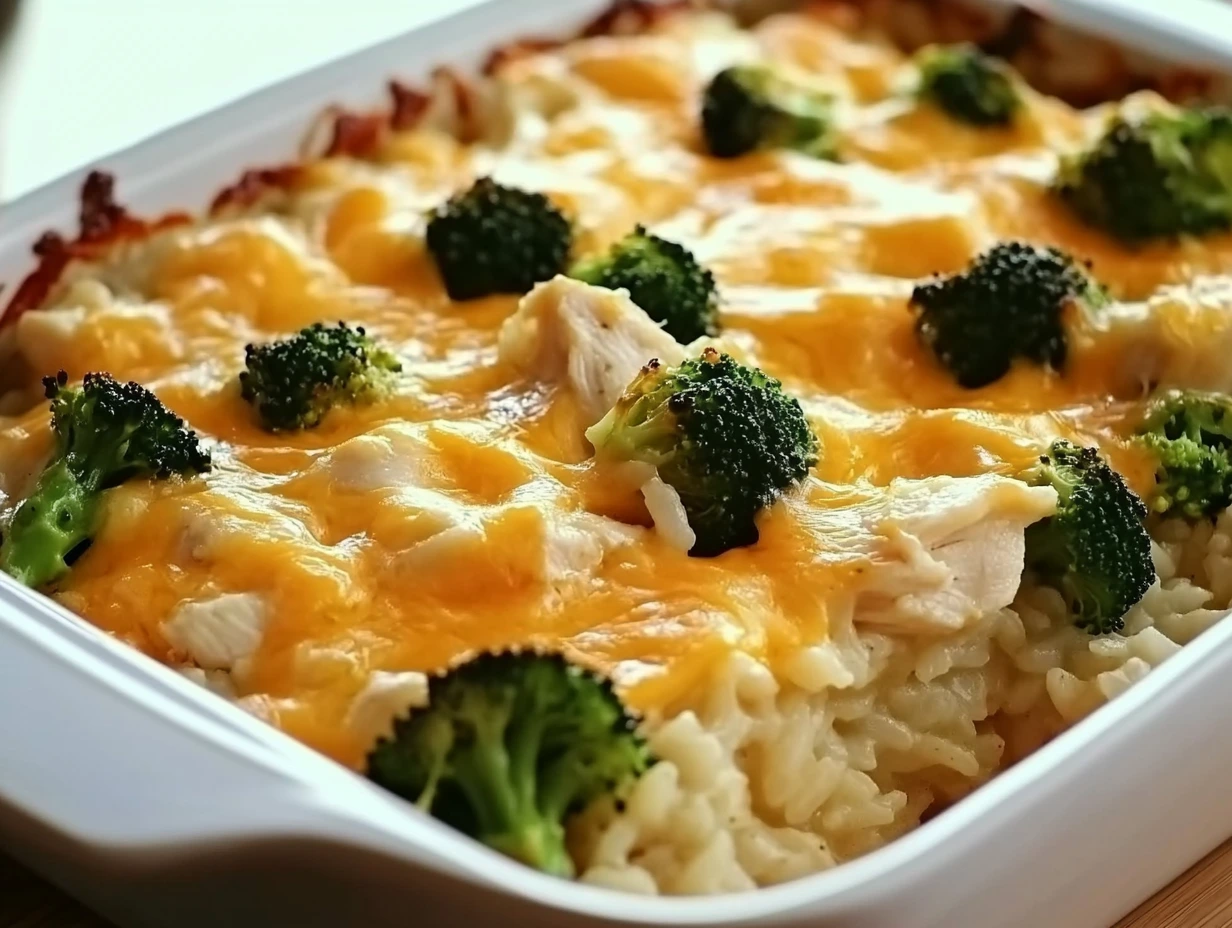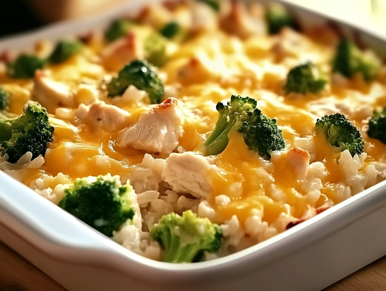 This dish is a cozy classic. We’re talking tender bites of chicken, fluffy rice, vibrant green broccoli, and melty cheddar cheese all folded into a creamy, savory base. The flavors blend together in the oven to create something that tastes like it simmered all day, even though it only takes about 30 minutes to bake. And let’s not overlook the versatility here—it’s great for using up leftover chicken or rice, and you can make it ahead for meal prep or freeze it for a busy night down the road.
