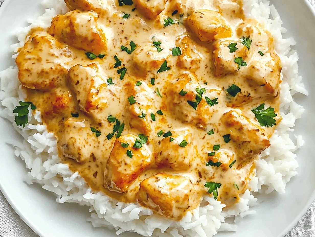 Perfectly seasoned, pan-seared chicken breasts rest atop a bed of fluffy rice, all smothered in a rich, cheesy cream sauce that’s packed with flavor. The combination of smoky paprika, garlic, and thyme brings just the right amount of seasoning, while cheddar and Parmesan melt into a velvety sauce that ties everything together.