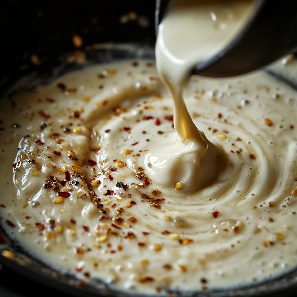 Once the garlic has become golden and fragrant, it’s time to pour in the heavy cream. This is where the dish gets its indulgent, creamy texture. Pour the cream in slowly while stirring to combine it with the garlic, ensuring it blends smoothly. Now, gradually whisk in the grated Parmesan cheese until it fully melts into the cream, creating that silky, luxurious sauce we all love.