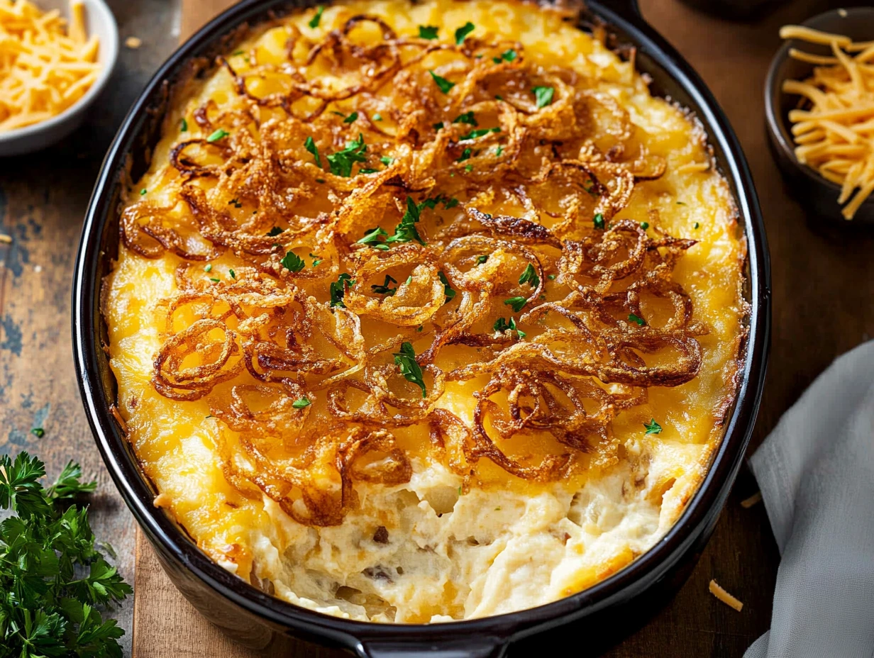 Let’s talk about what makes this casserole so special. Imagine the creamy goodness of shredded potatoes mixed with sharp cheddar cheese, all wrapped up in a luxurious homemade sauce that’s spiced to perfection. Top it all off with crispy, golden fried onions, and you’ve got yourself a dish that’s impossible to resist. Trust me, once you try it, you’ll want to make it for every occasion.