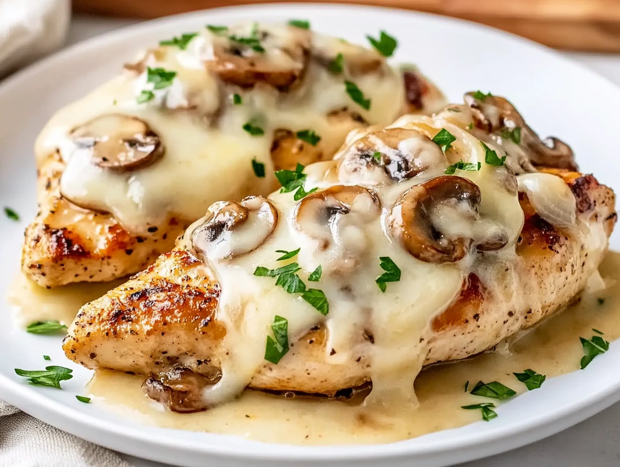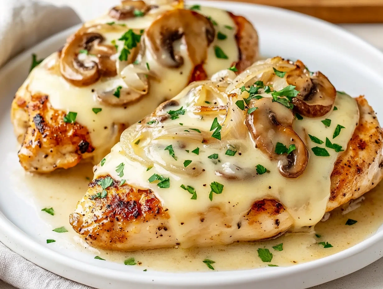- Layer the Toppings – Keep your chicken in the skillet (or transfer it to an oven-safe dish if needed). Evenly distribute the sautéed onions and mushrooms over each piece of chicken.
